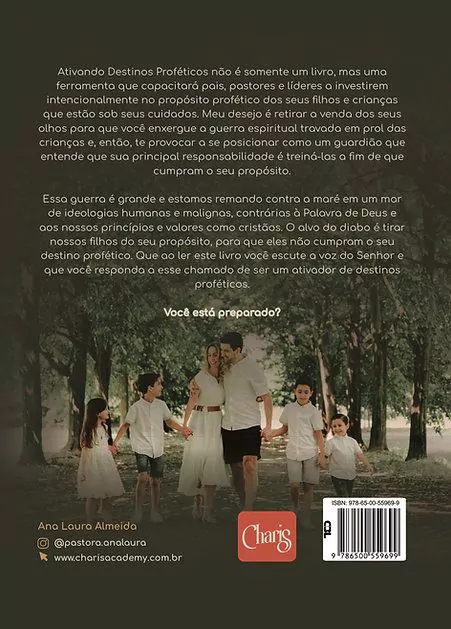 Este livro é uma ferramenta que capacitará pais, pastores e líderes a investirem intencionalmente no propósito profético dos seus filhos e crianças que estão em seus cuidados . meu desejo é que você enxergue a guerra espiritual travada em prol das crianças e então, te provocar a se posicionar como um guardião que entende que sua principal responsabilidade é treiná-las a fim de que cumpram o seu propósito . essa guerra é grande e estamos remando contra a maré em um mar de ideologias humanas e malignas contrárias à palavra de deus e aos nossos princípios e valores como cristãos. o alvo do diabo é tirar nossos filhos do seu propósito, para que eles não cumpram o seu destino profético. que ao ler este livro você escute a voz do senhor e que você responda a esse chamado de ser um ativador de destinos proféticos.